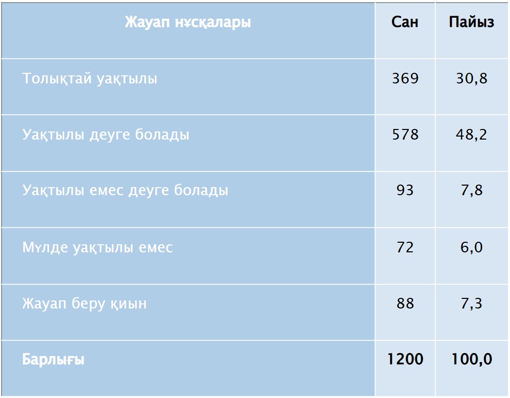 Сауалнама әдістемесі: телефон арқылы сауалнама 2026 жылғы 24-28 қаңтар аралығында жүргізілді. Сауалнамаға қатысқандар саны 1 200 респондент. Зерттеуге Қазақстанның 17 облысынан және республикалық маңызы бар 3 қаласынан (Астана, Алматы және Шымкент) 18 жастан асқан азаматтар қатысты. Телефондық сауалнама ұялы байланыс абоненттері арасында жүргізілді. Сауалнама қазақ және орыс тілдерінде өткізілді. Статистикалық ауытқуы 2,8%-дан аспайды.