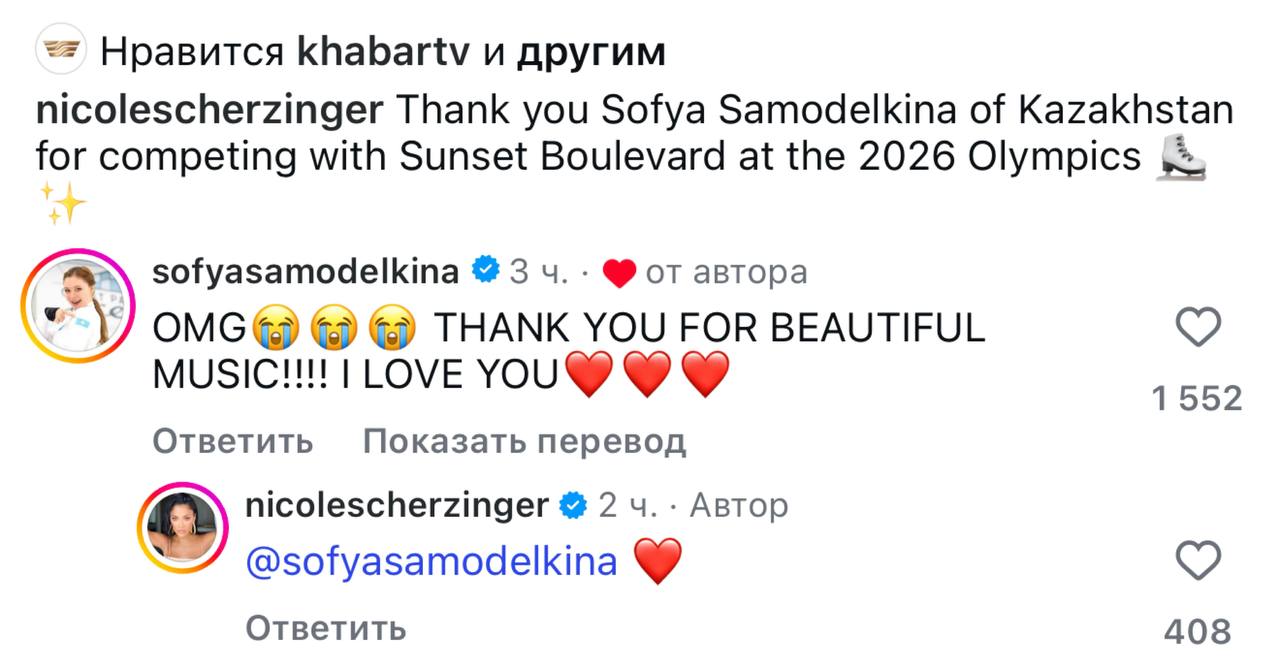 Америкалық әнші Николь Шерзингер қазақстандық мәнерлеп сырғанаушы Софья Самоделкинаға алғыс білдірді.
