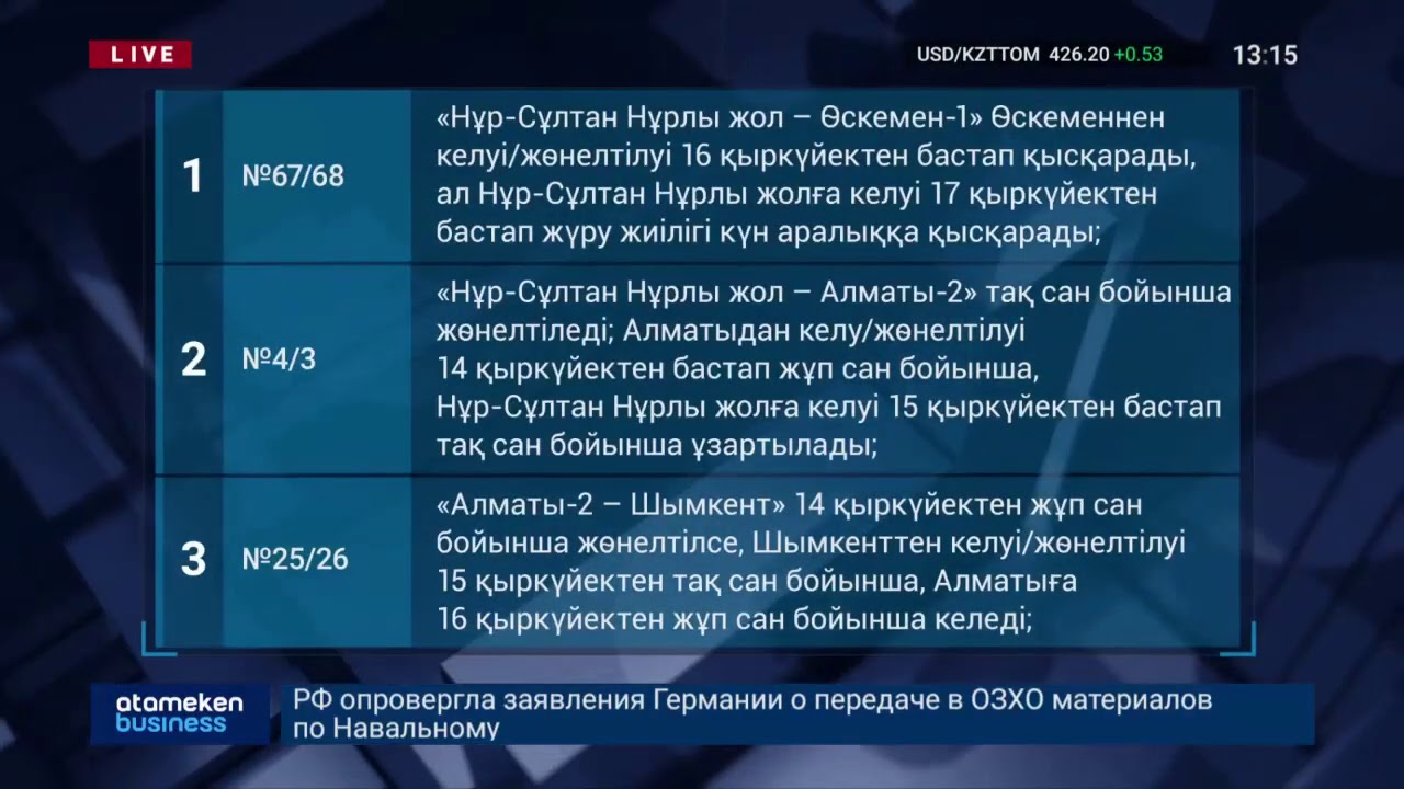 Елімізде бірқатар жолаушылар пойызының қозғалыс кестесі өзгерді. Жолаушылар тасымалы акционерлік қоғамының таратқан ақпарына сәйкес, 15 қыркүйектен Нұр-Сұлтан-Өскемен бағытындағы пойыз күн ара жүретін болады. Елорда мен Алматыға қатынайтын №4 пойыз тақ сан күндері жөнелтілсе, керісінше Алматыдан Нұр-Сұлтанға бағытталған күні жұп күндерге ауысты. Оңтүстік Астанадан Шымкентке жүретін теміржол транспорты күн аралық уақытқа қайта жанданып, жүру уақыты өзгертілді.