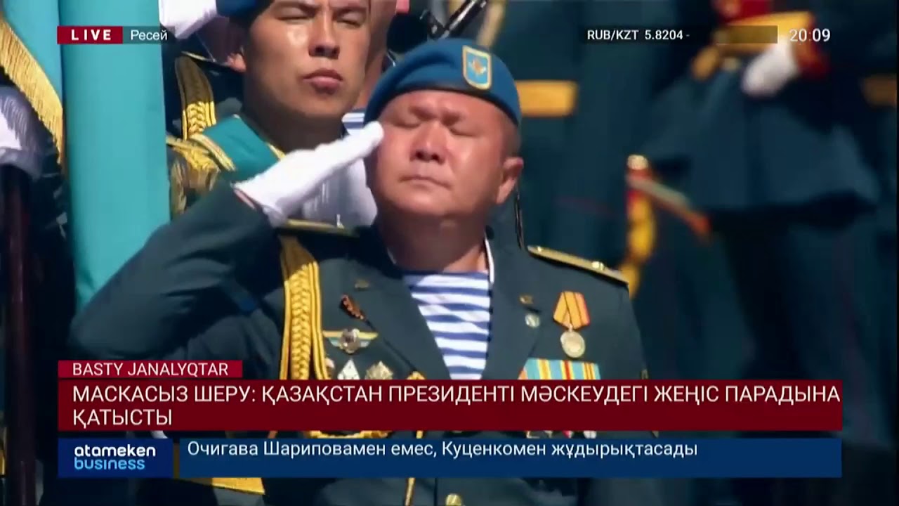Артынша 7 елдің басшылары парадты тамашалауға аттанды. Президенттер медициналық маска тағып келмеген. Себебі, вирустан қорғану талаптары дайындық кезінде қатаң сақталыпты. Жалпы, бұл шараға «инфекцияға иммунитеті бар» 13 мыңнан аса әскери қызметкер тартылған. Іс-шара барысында 200-дей әскери техника көрсетілді. Бұрын-соңды ешкім көрмеген ауыр машиналардың бірқатар үлгілері де паш етілді. Оған қоса, әуе күштерінің әуселесі таныстырылды. Осылайша, көкке 75 ұшақ пен тікұшақ көтерілді. Қазақстан атынан подполковник Ұлан Нұрғазиев бастаған сарбаздар Қызыл алаңмен жүріп өтті. Үндістаннан кейін шыққан отандық әскерилерді Қасым-Жомарт Тоқаев орнынан тұрып, құрмет көрсетті.