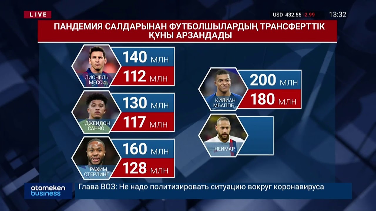 Коронавирус пандемиясы футбол жұлдыздарының трансферттік бағасын арзандатты. Барлық аяқ доп шеберлерінің құны бірден 9 млрд 220 млн евроға төмендеген. Бүгінде Испания чемпионатындағы, яғни ла лигадағы ең қымбат футболшы Лионель Мессидің трансферттік бағасы 140 млннан 112 млн еуроға дейін түсіп кеткен. Ал, бундеслигадағы Боруссияның ойыншысы Джейдон Санчо бұрын 130 млн еуро тұрса, қазіргі уақытта 117 млн болған. Сондай-ақ, Англия чемпионатындағы ең қымбат ойыншы, манчестер сити командасының өкілі Рахим Стерлинг 160 млн еуродан 128 млн еуроға дейін арзандапты. Франциялық ПСЖ командасының бетке ұстар ойыншысы Килиан Мбаппе 200 млн болса, қазір 180 млн, Ал, бразилиялық Неймардың бұрынғы құны 160 млн еуро болса, бүгінде 128 млн еуро екен.