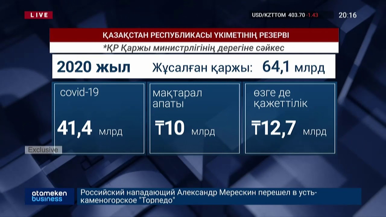 Үкіметтің қорында жұмсалмаған 198 млрд теңге бар. Қаржы министрлігі Atameken business арнасының резервтегі ақшаның есеп-қисабына қатысты жолдаған ресми сауалына осындай жауап қайтарды. Вице-министр Берік Шолпанқұловтың қолы қойылған құжатқа қарағанда, бұл 1-ші маусымдағы көрсеткішке сәйкес ақпарат. Жыл басында, яғни 1-ші қаңтарда қорда жалпы 76,7 млрд теңге болыпты. Бірақ соңғы төтенше жағдайларға байланысты 8-ші сәуірде 2020-2022 жылдарға арналған республикалық бюджет қайта бекітілгенде Үкімет резерві 185,4 млрд теңгеге ұлғайтылған. Нәтижесінде, қордағы қаражат 262,1 млрд теңгені құрапты. Қазір соның 64,1 млрд теңгесі жұмсалып қойған. Оның 41,4 млрд теңгесі пендемиямен күреске берілсе, өзгесі оқушыларды қашықтықтан оқыту мен Мақтаралдағы апатты жоюға шығындалған.