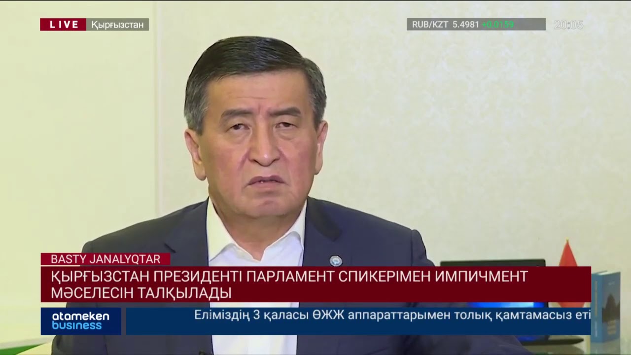 Қырғызстан Президенті Сооронбай Жээнбеков Парламенттің су жаңа спикері Мыктыбек Абдылдаевпен импичмент мәселесін талқылады. Бұл туралы мемлекет басшысының баспасөз хатшысы Толғанай Стамалиева хабарлады. Айтуынша, Заңды Президент мемлекетті құқықтық қалыпқа қайтарып, тездетіп тұрақтылық орнатуға үмітті. Жээнбеков Жогоргы Кенеш спикерін келісімге келуге шақырды. Президент тіпті кадрлық өзгерістер туралы жарлыққа қол қоюға дайын екенін білдіріпті. Толгонай Стамалиева Сооронбай Жээнбеков Бишкектен ешқайда кетпегенін де айтты. Қаперде болса, ақпарат құралдарында мемлекет басшысының жоғалып кеткені туралы жазылған болатын. Өз кезегінде Қырғыз Президенті бүгін халыққа кезекті үндеу жасап, байланысқа шықты.