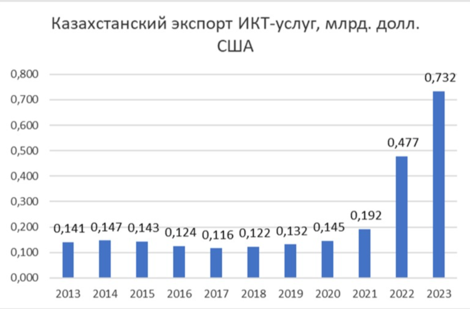 Казахстан демонстрирует существенный прогресс в формировании и развитии индустрии дата-центров. Согласно данным Всемирного банка, экспорт ИКТ-услуг Казахстана в 2023 году составил около 0,732 млрд долларов при значительном среднегодовом темпе роста 17,94%.