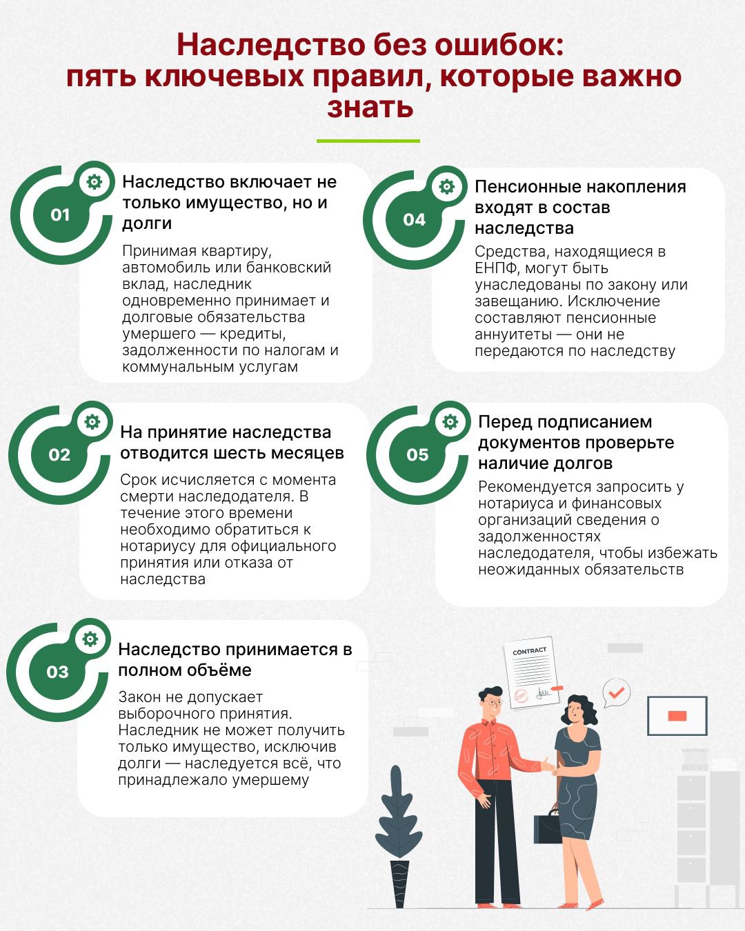 Важно помнить: наследство принимается в полном объёме — нельзя выбрать только выгодные активы. Оно включает всё имущество и обязательства, но долги погашаются лишь в пределах полученных активов.