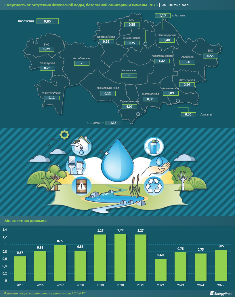 В Казахстане ситуация менее критична, однако далека от стабильной. В 2025 году показатель смертности, связанной с отсутствием безопасной воды, санитарии и гигиены, увеличился до 0,85 на 100 тыс. человек против 0,75 годом ранее.