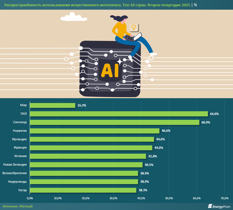 Лидерами по уровню внедрения стали Объединённые Арабские Эмираты (64%) и Сингапур (60,9%), где искусственный интеллект встроен в национальные цифровые экосистемы. Высокие показатели также продемонстрировали Норвегия (46,6%), Ирландия (44,6%), Франция (44%), Испания (41,8%), Новая Зеландия (40,5%), Великобритания (38,9%), Нидерланды (38,9%) и Катар (38,3%).