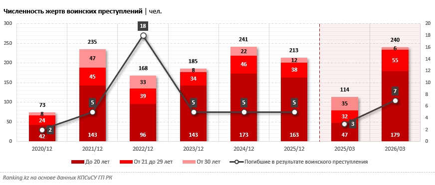 С 2020 года от преступлений в армии пострадали около 1,4 тысячи человек, включая 47 погибших. В 2026 году ситуация резко обострилась: только за первые три месяца число жертв достигло 240 человек, передает inbusiness.kz со ссылкой на ranking.kz.
