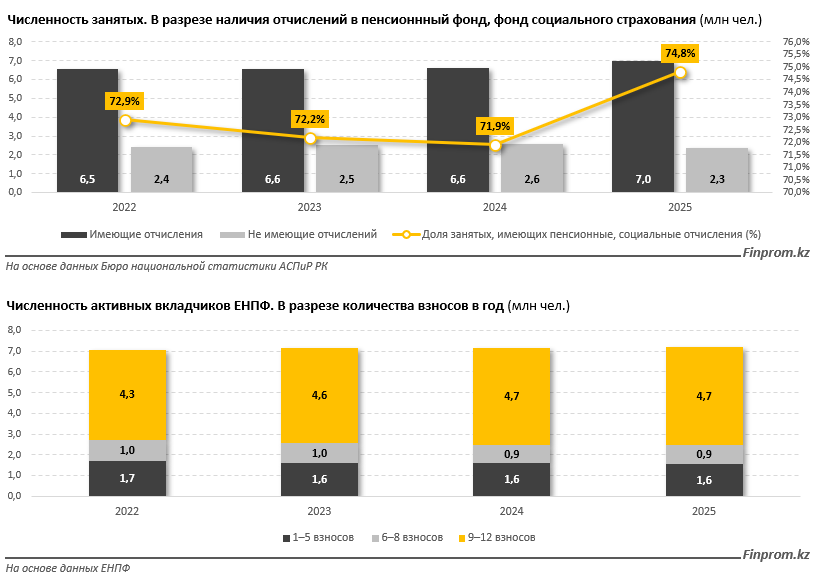 Согласно информации ЕНПФ, в прошлом году на пенсионные счета казахстанцев поступало регулярное пополнение только для 4,7 млн человек, что составляет две трети всех вкладчиков. Для 1,6 млн граждан деньги поступали на счёт лишь 1–5 раз в год, что также затрудняет накопление на пенсию.