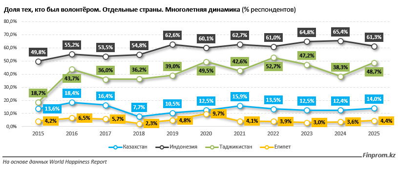Для сравнения, в Египте уровень волонтёрства остаётся крайне низким: только 4,4% опрошенных заявили о добровольной помощи, и эта цифра остаётся стабильной в последние годы.