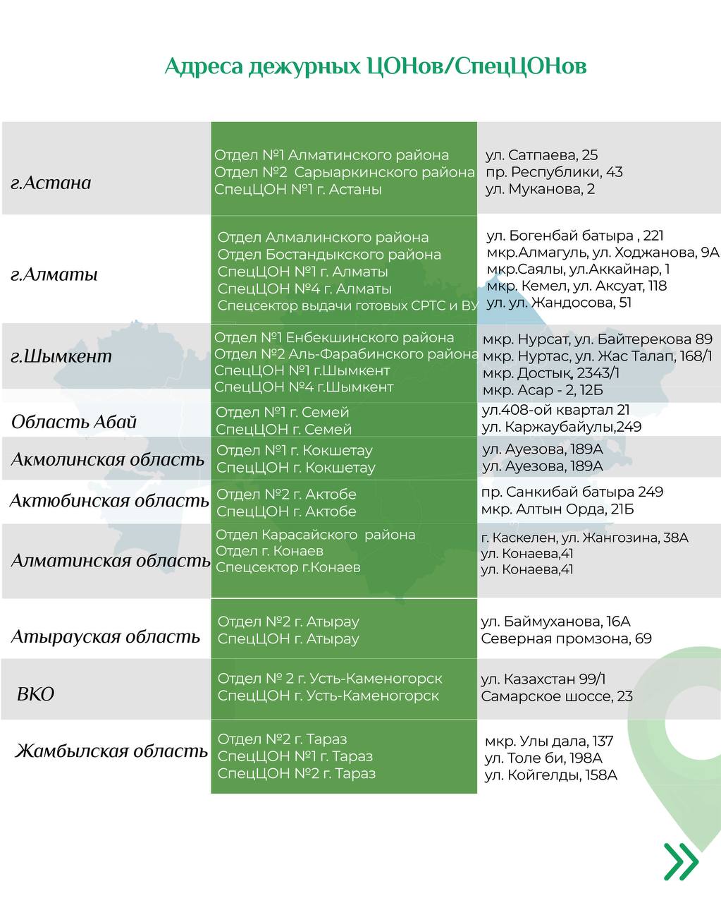 С 3 января в Алматы, Шымкенте, Семее, Актобе, Усть-Каменогорске, Уральске, Караганде и области Улытау, а также с 5 января в Астане, меняются адреса дежурных ЦОНов и спецЦОНов, передает inbusiness.kz.