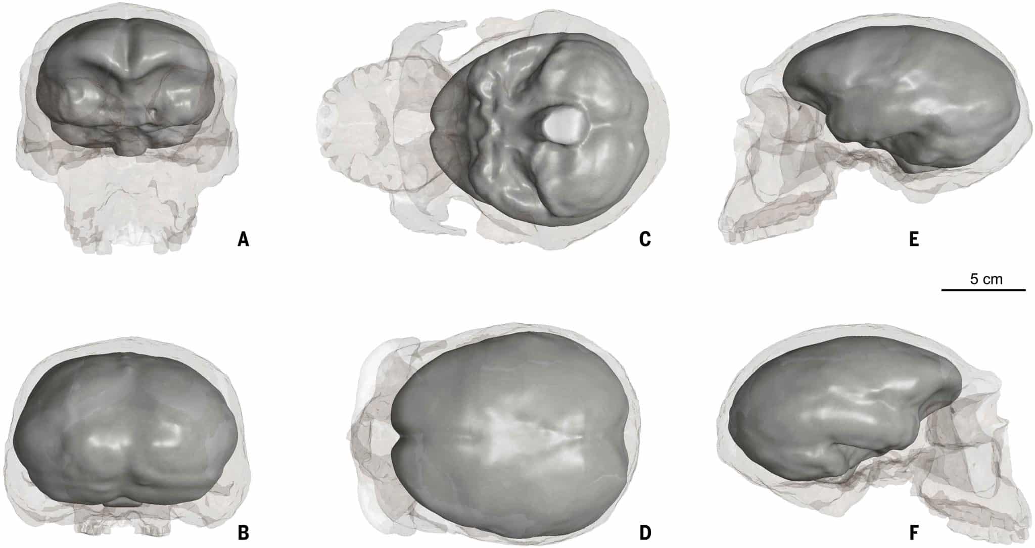 Фото 4: Компьютерная реконструкция черепа Юньсянь 2. (A-F) Вид спереди, сзади, снизу, сверху, слева и справа, соответственно / © Chris Stringer