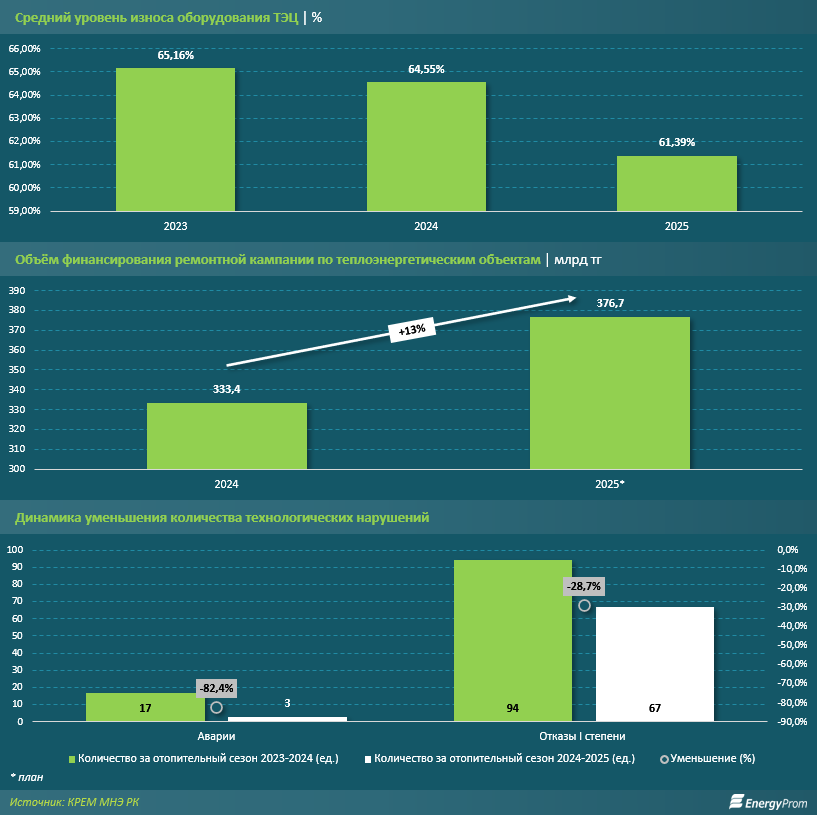 В коммунальном секторе Казахстана отмечается значительное улучшение показателей надёжности. Ключевым результатом прошедшего отопительного сезона стало резкое снижение аварийности. Число технологических нарушений сократилось сразу на 82,4% - это рекордный показатель за последние годы. Уменьшилось и количество отказов: первой степени - на 28,7%, второй степени - на 9,4%.