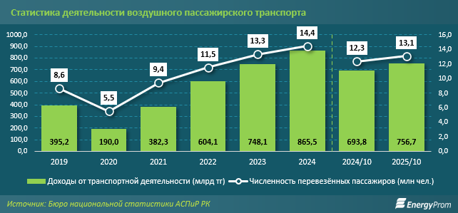 Статистика Бюро национальной статистики отражает динамику развития отрасли. Авиакомпании наращивают объёмы перевозок и усиливают финансовые показатели. Так, число пассажиров, перевезённых воздушным транспортом, увеличилось в прошлом году на 8,6%, а в январе-октябре 2025 года - ещё на 6,1%. За десять месяцев услугами авиалиний воспользовались 13,1 млн человек.