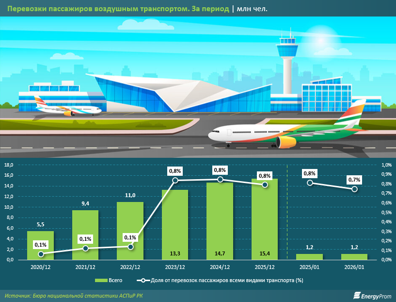 В начале 2026 года динамика остаётся стабильной. В январе воздушным транспортом перевезли 1,2 млн пассажиров — почти столько же, сколько за аналогичный период 2025 года. Рост составил 0,9%, что подтверждает сохранение высокого спроса на авиаперелёты.