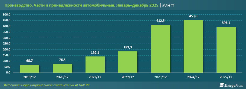 "Рост выпуска автокомпонентов развивается на фоне рекордных показателей автомобильной промышленности в целом. По итогам 2025 года в Казахстане было произведено 171,1 тыс. автотранспортных средств всех типов на сумму более 2,3 трлн тг. Такая синхронная динамика свидетельствует о расширении внутреннего автомобильного рынка и формировании устойчивого спроса на сопутствующие компоненты и принадлежности, включая сегмент вторичного обслуживания", - говорится в исследовании.