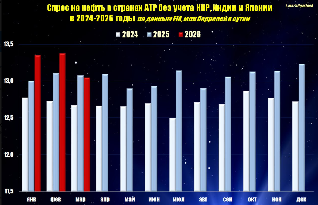 "Без учёта Китая, Индии и Японии Азиатско-Тихоокеанский регион сейчас потребляет порядка 13 млн баррелей в сутки, что, практически, идентично Европе. Такой показатель подчёркивает, что даже без крупнейших экономик Азия остаётся ключевым игроком на энергетическом рынке", - пишет OilGazLook.
