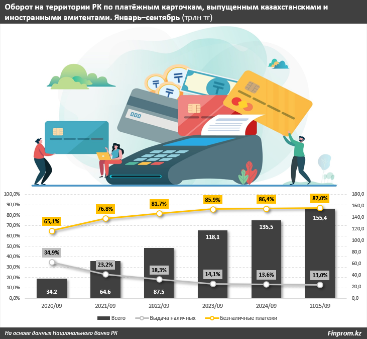 За январь–сентябрь текущего года оборот на территории Казахстана по платёжным карточкам, выпущенным казахстанскими и иностранными эмитентами, достиг 155,4 трлн тг — на 14,7% больше, чем за аналогичный период 2024-го, передает inbusiness.kz со ссылкой на Finprom.kz.