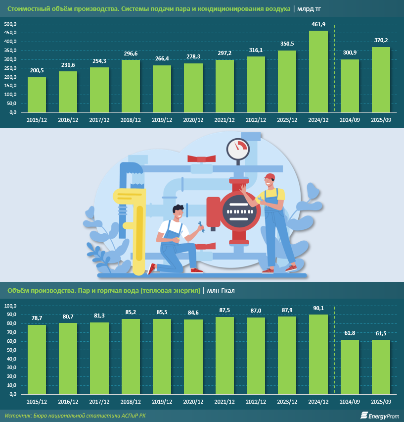 За девять месяцев 2025 года объём подачи тепла составил 61,5 млн Гкал, что сопоставимо с аналогичным периодом прошлого года. В денежном выражении производство в сфере теплоэнергетики достигло 370,2 млрд тенге.