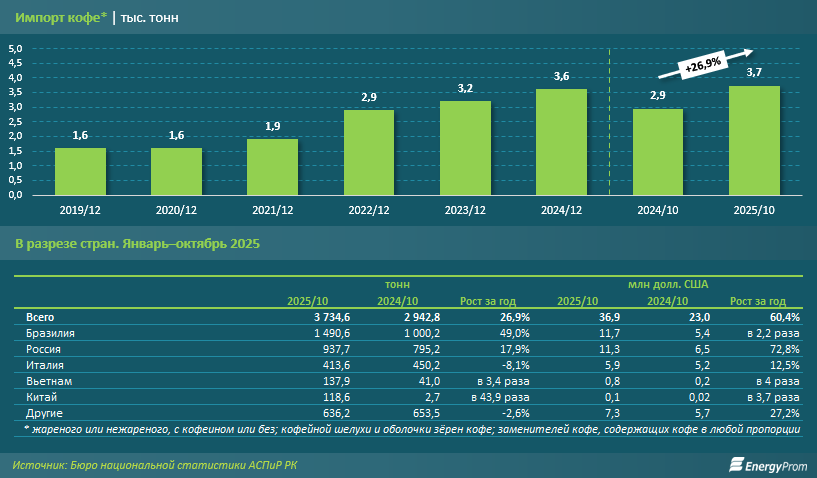 По данным таможенной статистики, публикуемым БНС, в январе–октябре прошлого года доля этой страны в общем объёме импорта кофе в Казахстан составила 39,9%. С бразильских плантаций арабики за 10 месяцев было поставлено около 1,5 тыс. тонн кофе — в полтора раза больше, чем годом ранее. Второе место по объёмам импорта этого товара в РК занимает Россия: 937,7 тонн кофе (плюс 17,9%) за январь–октябрь 2025-го. Не исключено, что основная масса этих поставок — российский реэкспорт.