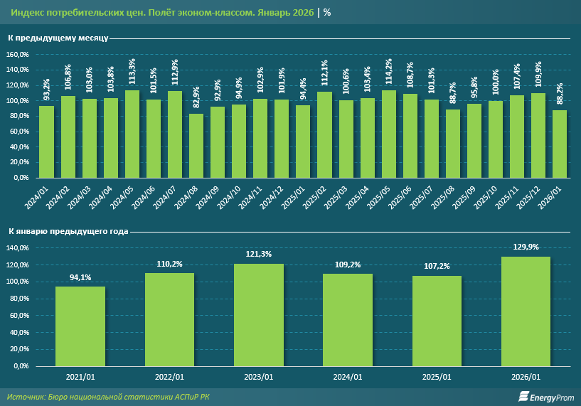"Казахстанская гражданская авиация продолжает наращивать и пассажиропоток, и выручку. При стабильной численности пассажиров в январе текущего года доходы отрасли за тот же месяц выросли на 12,5%. Рост был обеспечен в первую очередь ценовым фактором. Авиабилеты в январе 2026-го оказались почти на треть дороже, чем год назад, и это при практически нулевом росте пассажиропотока", - пишет Еnergyprom.kz.