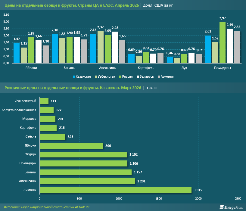 По данным Numbeo на апрель 2026 года, самые доступные цены на яблоки, картофель, лук и помидоры среди стран ЦА и ЕАЭС наблюдались в Узбекистане, передает inbusiness.kz со ссылкой на Еnergyprom.kz.