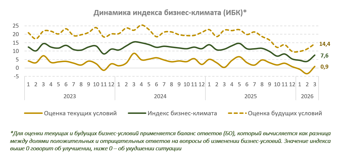 "При этом индекс бизнес-климата (ИБК) в марте 2026 года улучшился, составив 7,6 (в феврале — 3,8). Индикатор "часов" бизнес-цикла перешел в область роста. Оценка текущих условий оказалась слабоположительной, а оптимизм относительно будущих условий заметно улучшился", — подчеркнул эксперт.