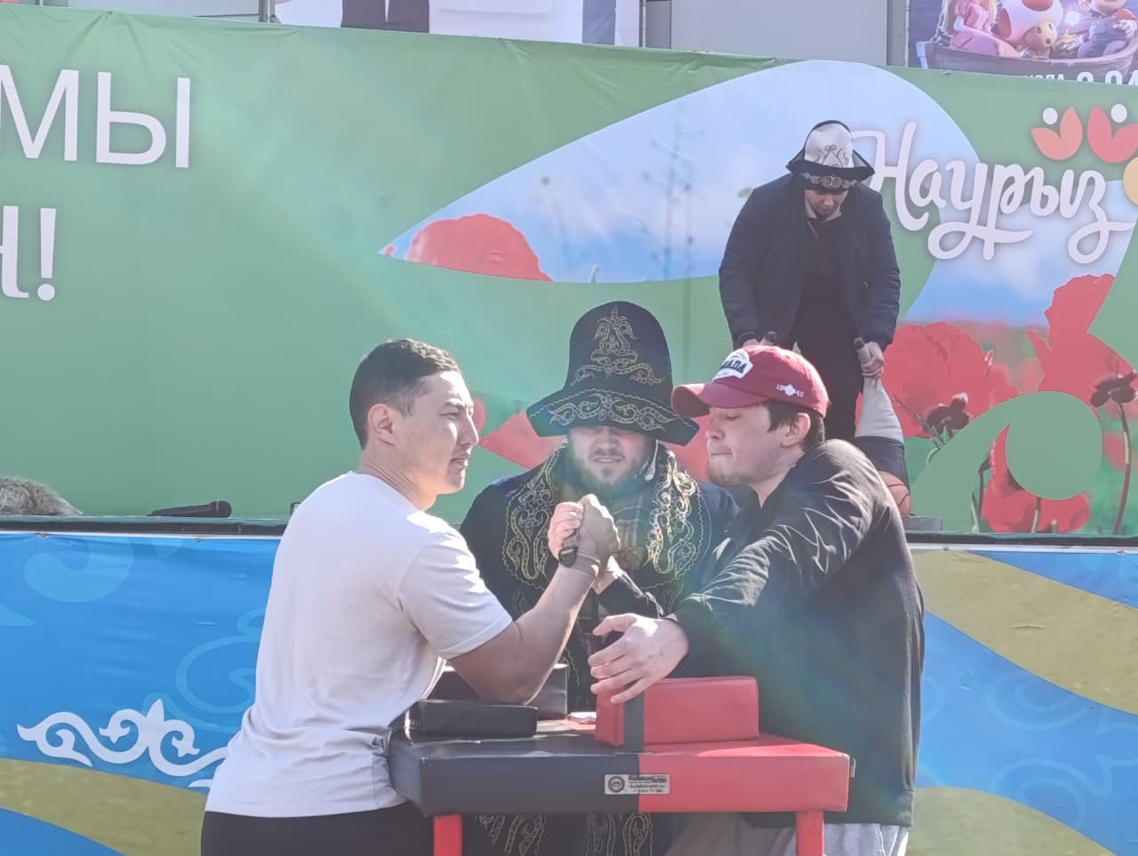 На следующей локации можно было не только посмотреть, но и поучаствовать в различных спортивных состязаниях. Мужчины соревновались в силе и выносливости в армреслинге, приседании с имитацией барана, меткости в асык ату, смекалке – в тогызкумалаке, а также в перетягивании каната. В последнем состязании по очереди участвовали не только мужчины, но и женщины и дети.
