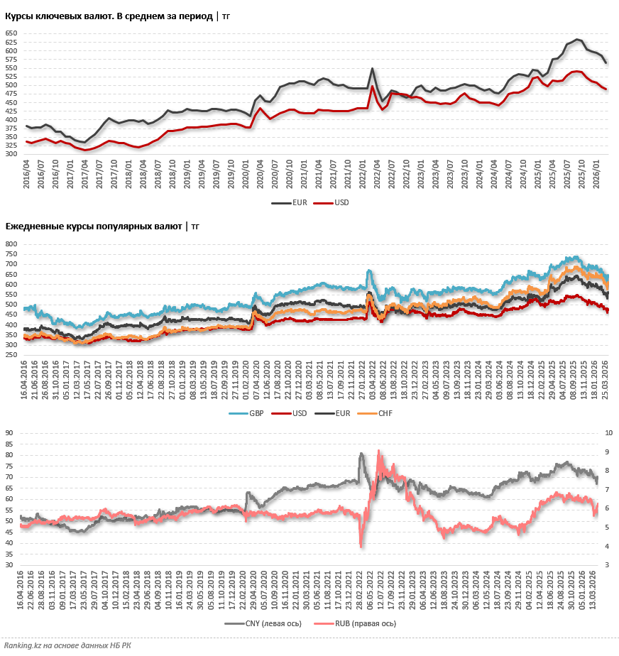 По данным Ranking.kz самый высокий курс доллара в 2026-м был зафиксирован 7 и 8 января (512,83 тг), самый низкий — 8 апреля (всего 460,37 тг — сразу на 10,2% меньше, чем на пике). И это лишь в текущем году. В целом же за всё время курс доллара достигал максимума 2 октября 2025 года: 549,15 тг. Это на 7,1% больше, чем в максимальной точке текущего года, и на 19,3% больше, чем в минимальной.