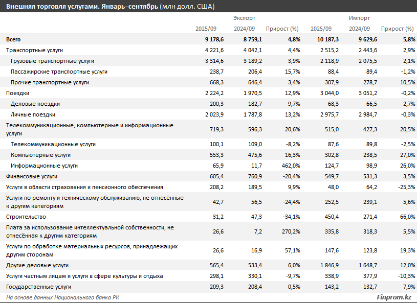 "В секторе прочих деловых услуг отрицательное сальдо углубилось до минус 1,3 млрд долларов на фоне более быстрого роста импорта (на 12%), по сравнению с экспортом (на 6%). Дополнительно давление оказывают строительные услуги (минус 419,2 млн долларов), а также платежи за использование интеллектуальной собственности (минус 309,2 млн долларов), что отражает зависимость от внешних технологий и компетенций", - отметили эксперты.