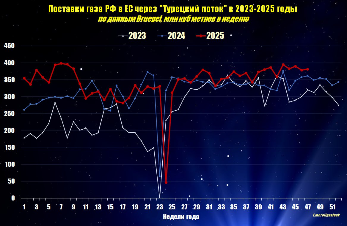 Согласно представленным данным, поставки российского газа в ЕС через "Турецкий поток" за истекший период 2025 года превысили 16 млрд куб метров. Этот показатель оказался на 8% больше соответствующего периода 2024 года и сразу на 33% выше аналогичного показателя 2023 года. Таким образом, за два года объемы прокачки по маршруту через Турцию продемонстрировали устойчивый и заметный рост.