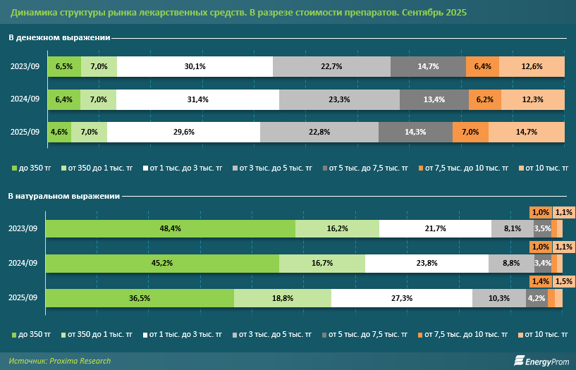 Согласно данным аналитической компании Proxima Research, за последние два года рынок лекарств претерпел серьёзные структурные изменения. В денежном выражении доля препаратов стоимостью до 350 тенге снизилась с 6,5% в сентябре 2023 года до 4,6% в сентябре 2025-го.
