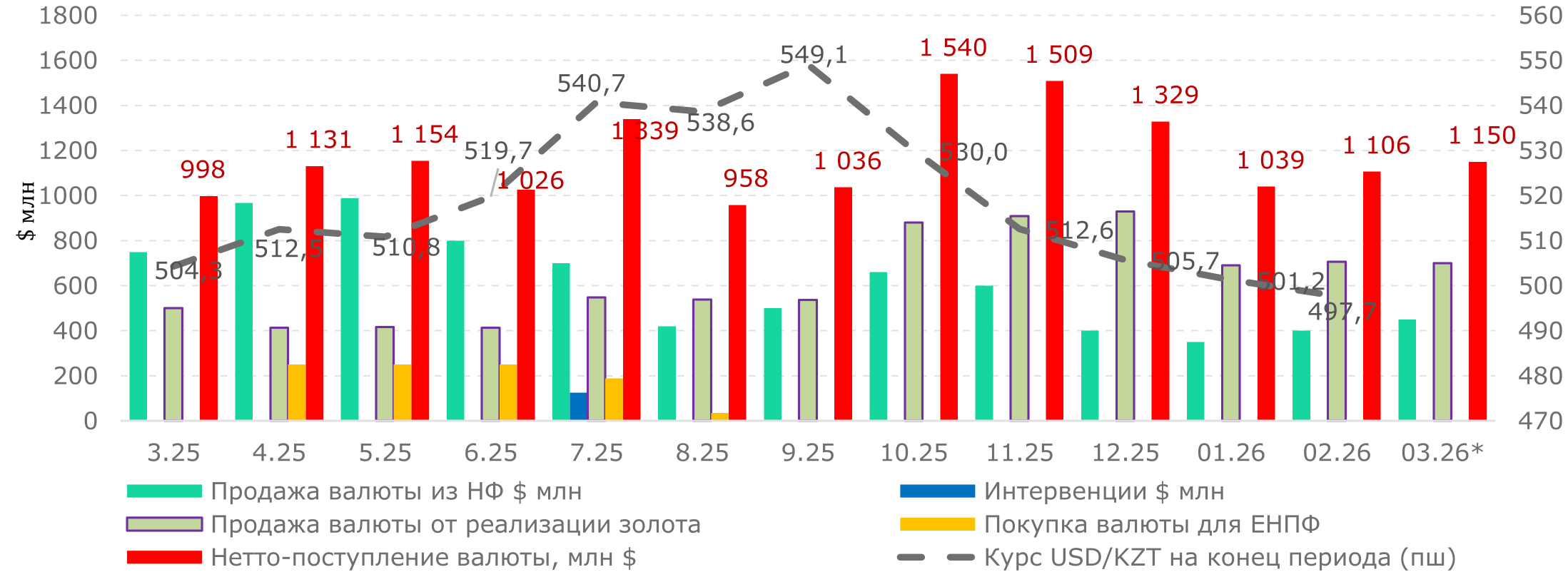 В рамках зеркалирования в марте 2026 года планируется продажа иностранной валюты в эквиваленте Т350 млрд, что ниже уровней 2025 года. Продолжится применение нормы об обязательной продаже 50% валютной выручки субъектами квазигосударственного сектора. Приобретение валюты для ЕНПФ в марте 2026 года не планируется. В итоге, чистые продажи валюты со стороны НБК в марте составят порядка 1 150 млн долларов (в нетто-продажи Нацбанка входят сумма продажи валюты из НФ и сумма продажи валюты от реализации золота).