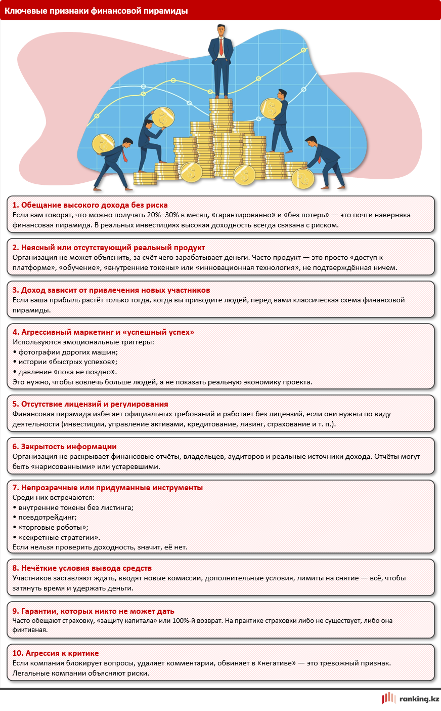 Существуют разные виды финансовых пирамид, в том числе действующие в Казахстане. Причины, по которым люди попадаются на их уловки, остаются прежними: желание быстрой прибыли, недостаток финансовой грамотности и психологическое давление.