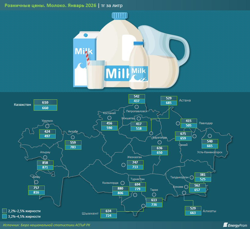 Розничные цены на молоко в январе 2026 года существенно различались в региональном разрезе. Средняя стоимость по Казахстану составила 610 тг за литр для молока 2,2%–2,5% жирности и 660 тг для молока 3,2%–4,5% жирности, передает inbusiness.kz со ссылкой на Еnergyprom.kz.