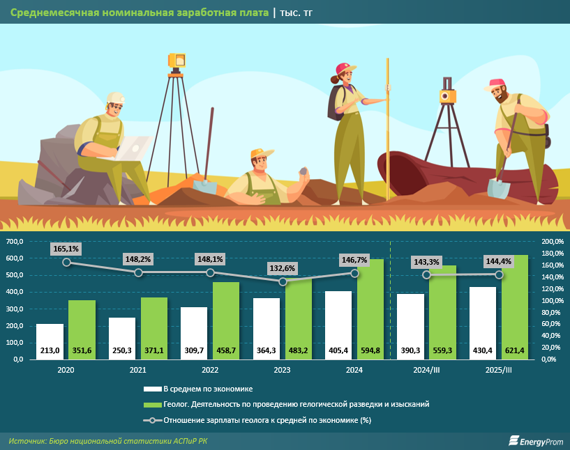 Согласно данным бюро национальной статистики АСПиР РК, в третьем квартале прошлого года среднемесячная номинальная зарплата работников в сфере геологоразведки составила 621,4 тыс. тенге. По сравнению с аналогичным периодом 2024 года показатель вырос на 11,1%. В целом за последние годы зарплаты геологов регулярно индексировались - примерно раз в два года рост достигал около 23%.
