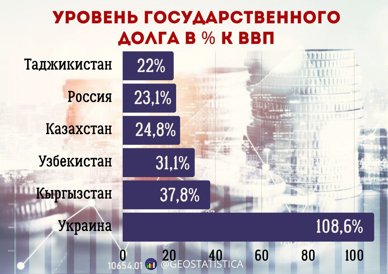 На этом фоне ситуация в странах СНГ выглядит куда более разнообразной. Лидером по минимальному уровню госдолга к ВВП стал Таджикистан с показателем 22%. Россия занимает вторую позицию с уровнем 23,1%. Казахстан расположился следом — 24,8% от ВВП. Далее идут Узбекистан с показателем 31,1% и Кыргызстан — 37,8%.