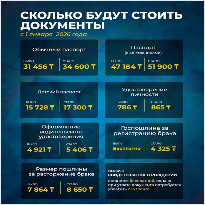 Важно отметить, что с 1 января 2026 года вступят в силу поправки Налогового кодекса, касающиеся объектов взимания и ставок государственной пошлины. В частности, лица, впервые обращающиеся за получением удостоверения личности гражданина РК (по достижению 16-летнего возраста, включая лиц старше 18 лет, на основании паспорта бывшего СССР образца 1974 года или его восстановления по утрате, а также при замене удостоверения в связи с истечением срока действия), будут освобождены от уплаты государственной пошлины.