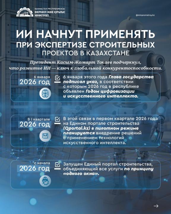 "В этой связи, в первом квартале 2026 года в пилотном режиме планируется внедрение решений на базе ИИ на Едином портале строительства Qportal.kz. Новые технологии будут использоваться при прохождении комплексной вневедомственной экспертизы проектов строительства и позволят автоматизировать проверку комплектности исходной и разрешительной документации, загружаемой заявителями", - пояснили в минпромстрое.