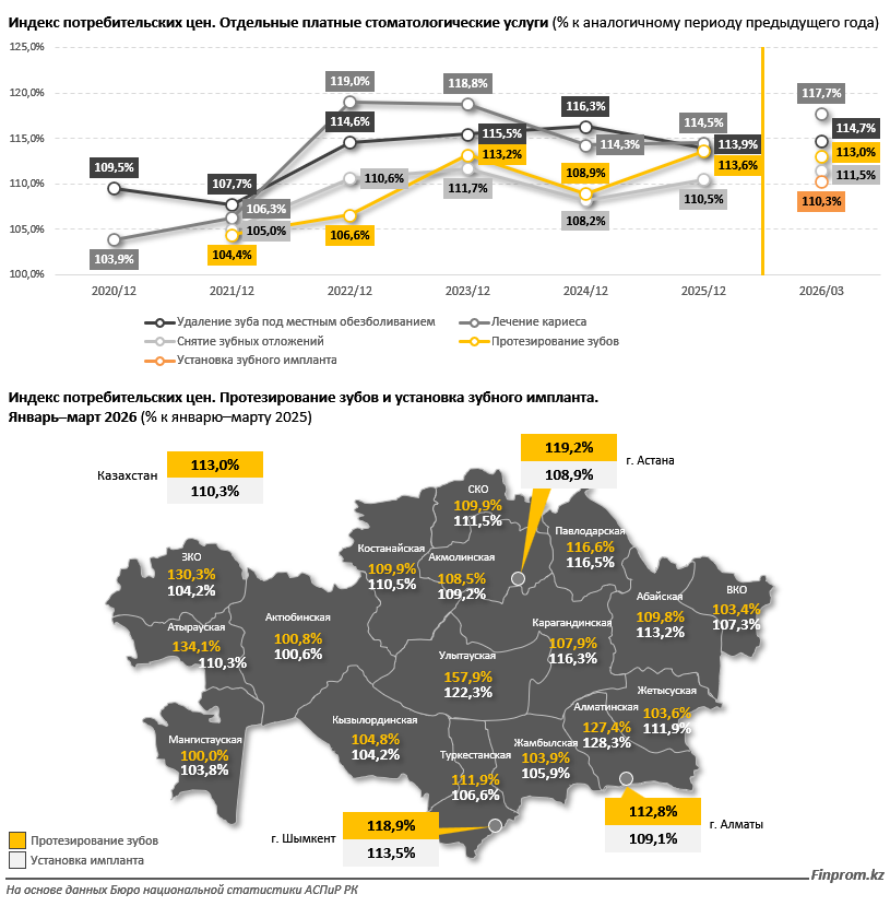 С начала 2026 года стоматологические услуги в Казахстане заметно выросли в цене, причём темпы удорожания сильно различаются по регионам, передает inbusiness.kz со ссылкой на finprom.kz.
