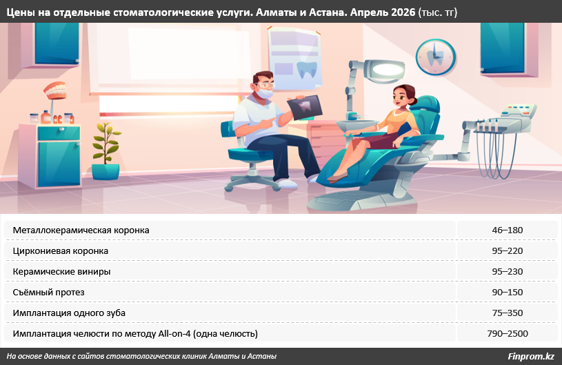 Имплантация и протезирование зубов в Казахстане становятся всё менее доступными для пациентов. Сбор данных о стоимости услуг оказался непростым: часть стоматологических клиник в регионах предоставляет прайс-листы только по индивидуальному запросу.