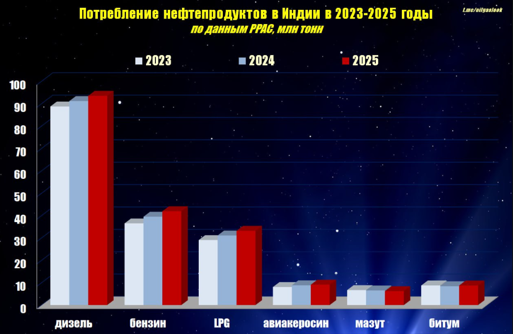 Мировой рынок нефти в 2025 году все отчетливее опирается на один ключевой фактор — устойчиво растущий спрос со стороны Индии. Пока в ряде развитых стран потребление нефтепродуктов стагнирует или снижается, индийская экономика продолжает наращивать использование топлива практически по всем основным направлениям, фактически вытягивая глобальный рынок, передает inbusiness.kz со ссылкой на телеграм-канал OilGazLook.