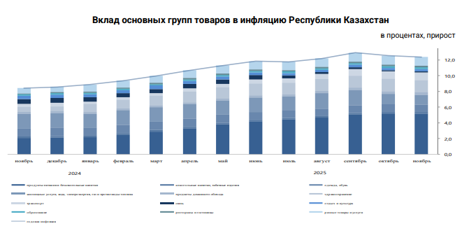 Инфляция в Республике Казахстан в ноябре 2025 года за год составила 12,4%, тогда как в октябре этот показатель был выше — 12,6%. За месяц цены выросли на 0,8% против 0,5% месяцем ранее. Основной вклад в годовой уровень инфляции внесли продукты питания и безалкогольные напитки — 5,2 процентных пункта, здравоохранение — 1,5 процентных пункта, а также жилищные услуги — 1,2 процентных пункта.