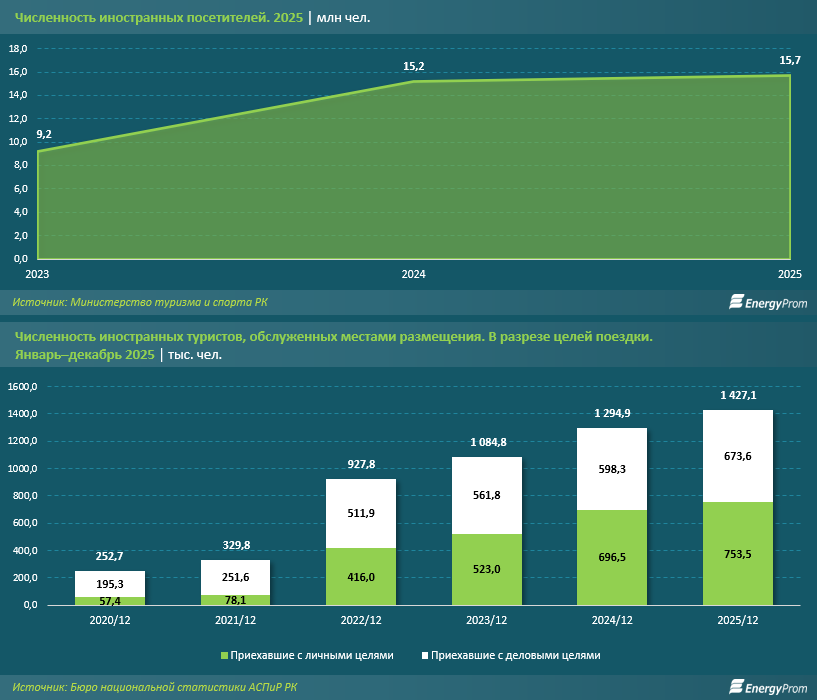 По данным Еnergyprom.kz, в целом в прошлом году в казахстанских гостиницах, отелях и хостелах останавливались более 1,4 млн иностранных туристов. Из них около половины (673,6 тыс. человек) сообщили о деловом характере своей поездки, что не исключает их туристический статус. Ещё 753,5 тыс. человек приехали с личными целями.