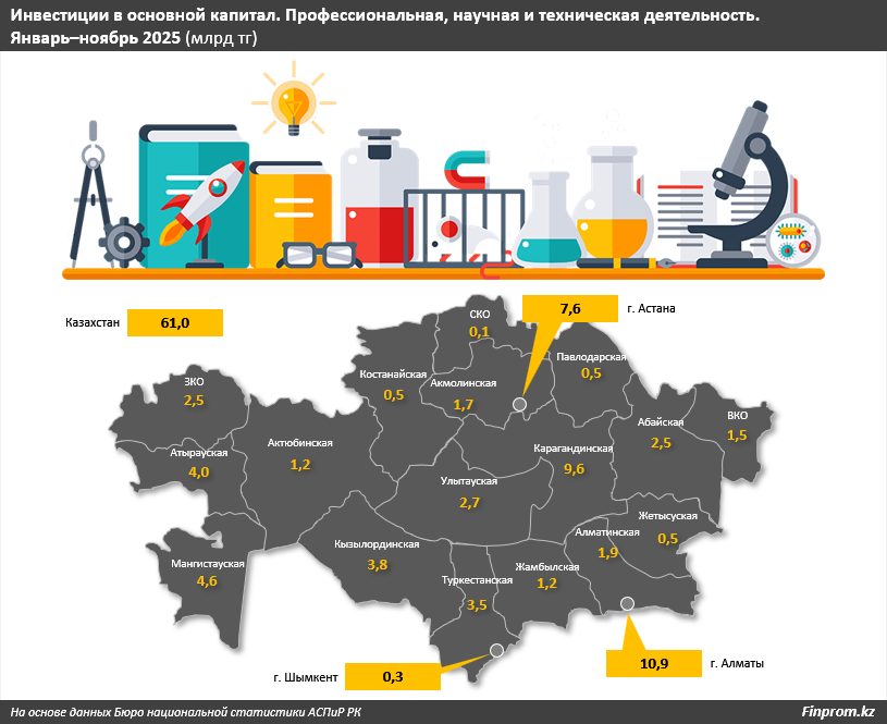 В Казахстане, объявившем 2026-й Годом цифровизации и искусственного интеллекта, наблюдается тревожная тенденция: капитальные вложения в профессиональную, научную и техническую деятельность в 2025 году оказались минимальными среди всех направлений экономики и сократились почти вдвое, передает inbusiness.kz со ссылкой на finprom.kz.