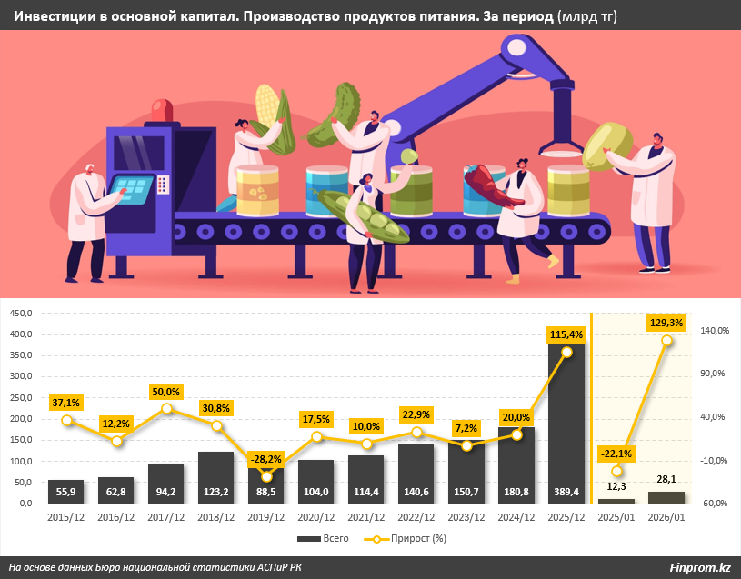 С января по декабрь 2025 года инвестиции в основной капитал в сфере производства продуктов питания составили 389,4 млрд тенге против 180,8 млрд тенге годом ранее. Таким образом, показатель вырос более чем вдвое, а индекс физического объёма достиг 208,1%. Для отрасли это не просто положительная динамика, а качественный скачок, значительно превышающий темпы прошлых лет.