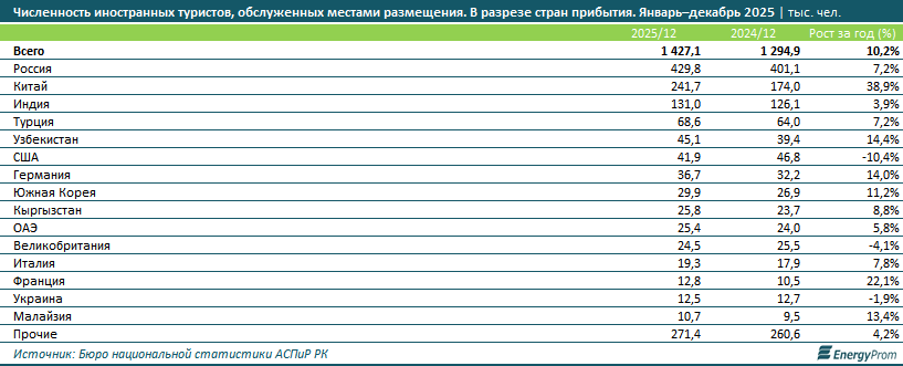 "Таким образом, помимо роста общей численности иностранных туристов в 2025-м наблюдалась диверсификация этого "рынка": наряду с традиционными источниками туристического потока (Россией и Китаем) увеличился интерес к РК со стороны граждан стран Европы и Южной Азии", - говорится в исследовании.