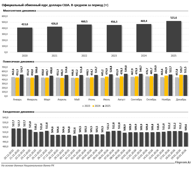 В помесячной динамике минимальный курс доллара в 2025 году был зафиксирован в марте (498 тг), максимальный — в сентябре (540,7 тг). В декабре среднемесячный курс составил 511,5 тг — на 2,2% ниже, чем месяцем ранее.
