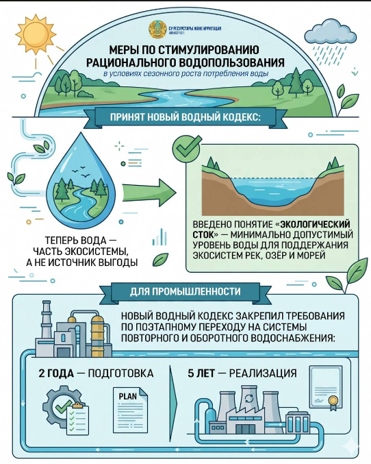 "Ключевым шагом стало принятие нового Водного кодекса. Если ранее вода рассматривалась, преимущественно, как средство получения финансовой выгоды, то теперь она закреплена как важнейшая часть экосистемы. Такой подход отражает глобальный тренд перехода к устойчивому управлению природными ресурсами. В документе впервые введено понятие "экологический сток" — минимально допустимый уровень воды, необходимый для поддержания экосистем рек, озер и морей. Это решение направлено на предотвращение истощения водных объектов и сохранение биоразнообразия", - отметили в минводы Казахстана.