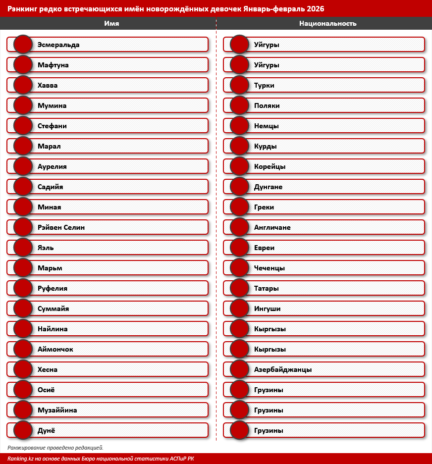 Отдельным блоком можно выделить редкие имена девочек других национальностей, то есть не казахов и не русских. Они не менее красивы и благозвучны, но уже на свой манер, передает inbusiness.kz со ссылкой на Ranking.kz.